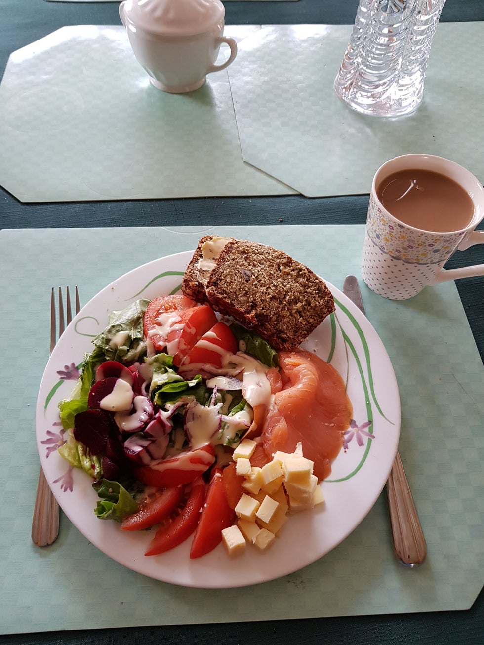 Smoked Salmon Salad, with Beetroot, Tomatoes, Peppers, Cheese, Red Onion, Salad Dressing, and Lettuce, served with Homemade Brown Bread and a cup of Tea or Coffee