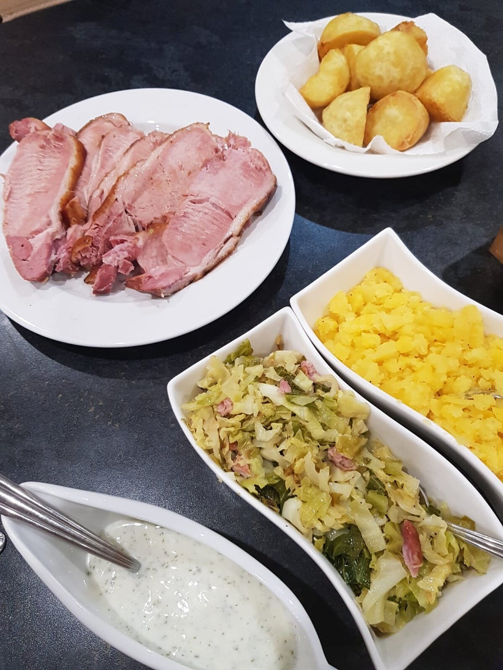 Roast Bacon Joint, Roast Potatoes, Steamed Turnips Sautéed Cabbage with bacon bits Parsley Sauce